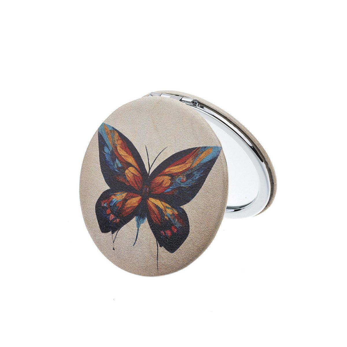 Compact Mirror with orange butterfly on light background.