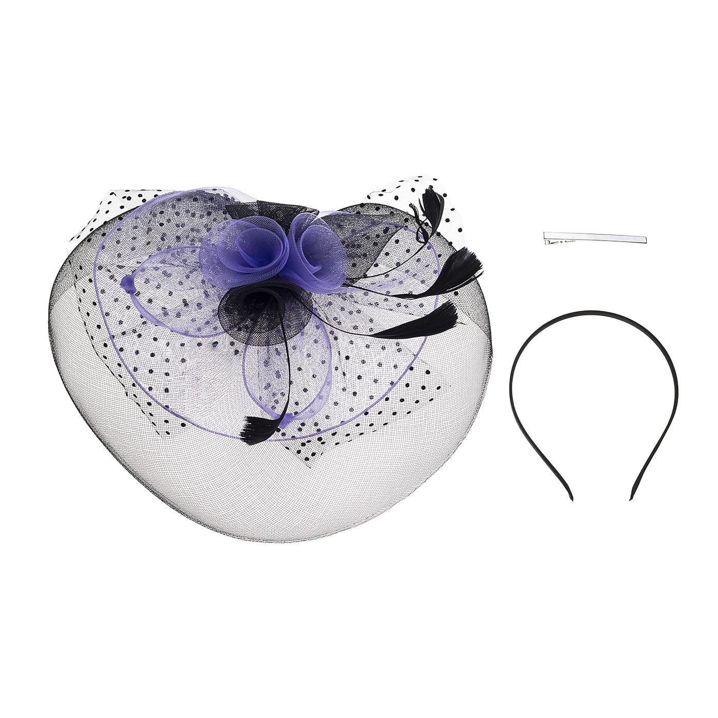 4 flowers, netting, spotted mesh layer and 4 statement feathers.